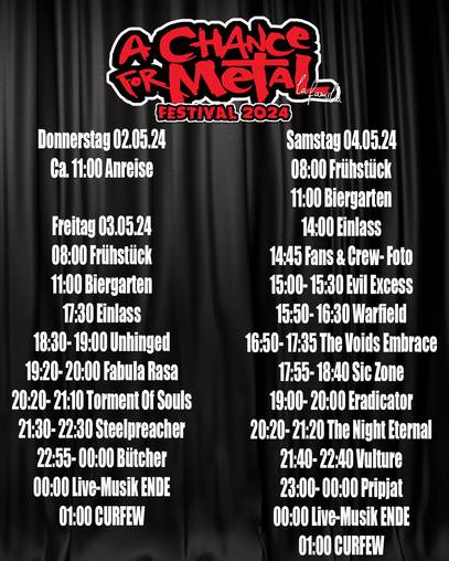 Bands, die das A CHANCE FOR METAL FESTIVAL 2024 rocken werden: • BÜTCHER • ERADICATOR • EVIL EXCESS • FABULA RASA • PRIPJAT • SIC ZONE • STEELPREACHER • THE NIGHT ETERNAL • THE VOIDS EMBRACE • TORMENT OF SOULS • UNHINGED • VULTURE • WARFIELD