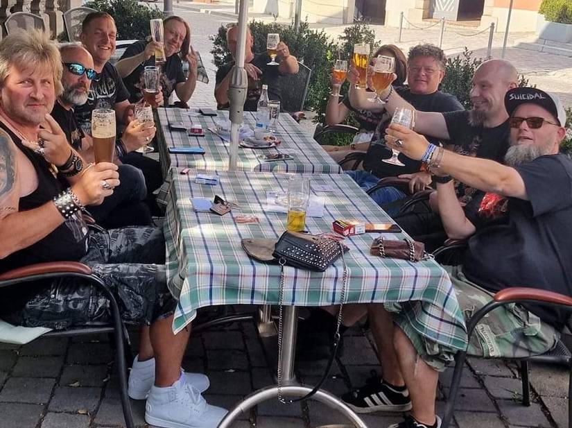 Zu 15 Uhr schlenderte ich die Hauptstraße von Burglengenfeld entlang und lief förmlich Tom in die Arme. Seines Zeichens Hauptbooker für Bands in der Metalheads Forever Rockcast Show. Er saß auf einer Treppe, bei der er warten wollte auf weitere Fanclubmitglieder. Treffpunkt war in einem Café-Restaurant beim Hotel 3 Kronen. Dort angekommen, fielen wir uns wieder um die Arme, wie alte Freunde. Es saßen dort bereits Dö, Sturmi, Harry mit Tochter, Kutten Ralle, und Michael Lohrmann. Lustig war auch, wer alles so die Hauptstraße von Burglengenfeld entlang bretterte. Die Hauptstraße wurde regelrecht als Flaniermeile benützt. Ein paar dickere Schlitten fuhren entlang, und die Biker posierten auf ihren Harleys. Ein lustiges Rendezvous. Für einen weiteren Lacher sorgte die Bedienung, die uns für eine Band hielt. Kurze Zeit später stießen dann noch „Herr Ginster, bitte zur Kasse“-Tom dazu, mit Dannerl und Ralf. Abermals feste Umarmungen. Es wurde der neuste Schnack geteilt und man unterhielt sich, wer den noch Anreisen wird, bzw. wer nicht erscheinen wird, bei Bier und Sonnenschein. Natürlich war auch der kürzlich verstorbene Metalhead Steff Thema. Ralle stand über Nadine im Kontakt zur Familie von Steff. Wir salutiertem ihm und wir waren sicher, dass er gewollt hätte, dass wir ordentlich abfeiern, auch für ihn. Das werden wir heute und auch in Zukunft tun – R.I.P. Steff!