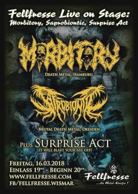 Am kommenden Wochenende gibt es wieder mächtig auf die Fresse, in der Fellfresse! Dann gibt es im Wismarer Szenenadelöhr wieder einen dreckigen Batzen Death Metal auf die Weichteile gezimmert! Dazu werden MORBITORY aus Hamburg und SAPROBIONTIC aus Elbflorenzmetropole gastieren. Losgeballert wird um 20.00 Uhr und zur Druckbetankung könnt ihr Euch gern eine Stunde früher einfinden. Horns Up!