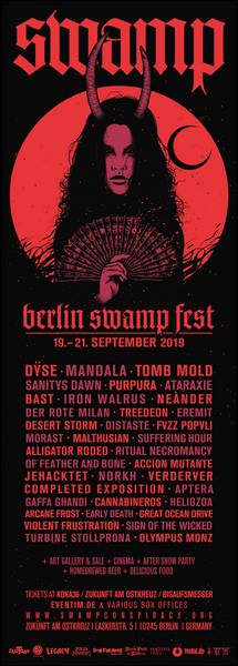 Im sechsten Jahr zeigt sich das Berlin Swamp Fest erneut von seiner lauten Seite! Vom 19. – 21. September 2019 haben die Veranstalter vom Verein Swamp Conspiracy ein Top-Billing mit ausgewählten Highlights, langjährigen Favoriten und einigen Überraschungen vorbereitet. Mit dabei sind unter anderem: Neànder, Sanitys Dawn, DŸSE, Bast, Distaste, Fvzz Popvli, Iron Walrus, Accion Mutante, Eremit, Tomb Mold und Ritual Necromancy. Insgesamt spielen 36 Bands an drei Tagen auf mehreren Bühnen – Indoor und Outdoor.