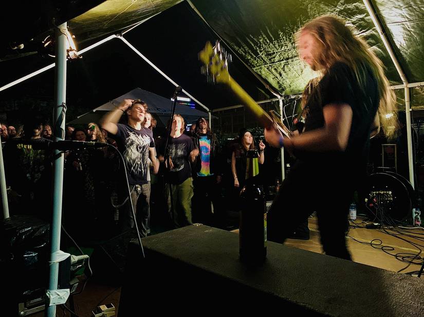 FUCHUR, die erste Band von fünf, machten den Anfang und wärmten unsere verkaterten und leicht ausgekühlten Körper mit krachendem Stoner Metal und einer gesunden Portion Slowparts auf. Solider Auftritt der mir bis dato unbekannten Band. Normalerweise würde ich jetzt etwas über KRACHMANINOV schreiben, doch leider mussten diese krankheitsbedingt absagen. SPUTA konnten kurzfristig einspringen und sorgten für einen vollen Tanzbereich vor der Bühne anstatt eines leeren Slots auf der Running Order. Die Jungs heizten den anwesenden mit ihrer Mischung aus Grindcore und D-Beat ordentlich ein und schoben gefühlt die Regenwolken mit dem Ende ihres Konzertes beiseite.