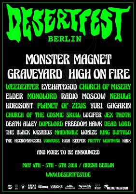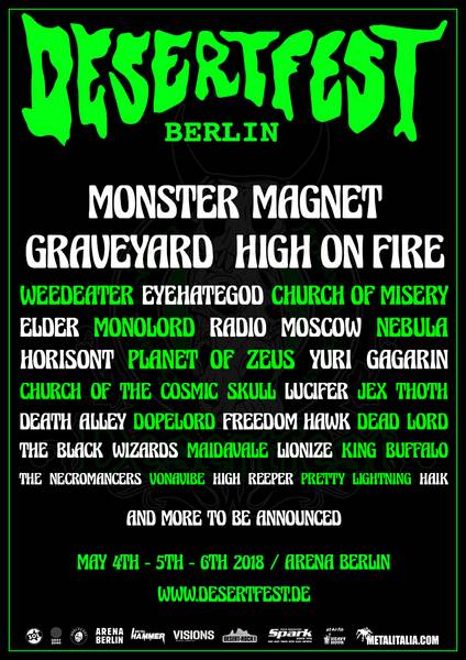 Mit Headliner Monster Magnet am Freitag hat man gleich eine erfahrene Band am Start, die diesen Sound maßgeblich mitgeprägt hat und auf die sich einfach jeder wird einigen können. Die Band hat zudem ein neues, wieder etwas drückenderes Album am Start und wird ihr Set mit den unverzichtbaren Space Rock-Hymnen aufwerten. Die doomigen Japaner Church of Misery, die psychedelisch im Kielwasser von alten Sabbath fahren sowie die schwer verdaulichen Weedeater (Name ist Programm) sind weitere Highlights an diesem Eröffnungstag. Die jamlastigen, obskuren Niederländer Death Alley -ebenfalls mit neuem Album- haben schon als Vorband von Kadavar zuletzt eine fantastische Visitenkarte abgeliefert. Auch auf diese Band sollte man achten. Nebula (USA) und Monolord (Swe) sind dann eher was für reine Stoner-Freaks, die sich einfach gern in Riffkaskaden suhlen.