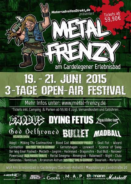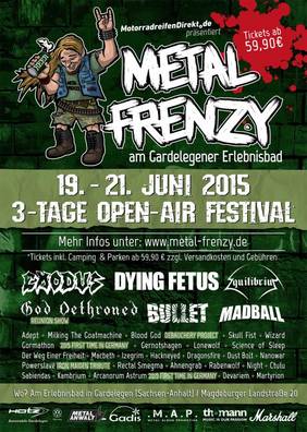Erneut ein Neuzugang in der Zephyr's Odem'schen Festivalrubrik: Das Metal Frenzy. Im schönen Gardelegen beheimatet haben die Macher in diesem Jahr eine Vielzahl an illustren Vertretern der gitarrenorientierten Unterhaltsmusik zusammengekart, die in 3 Tagen das nebenan beheimatete Spaßbad (akustisch) dem Erdboden gleichmachen werden. Lest unseren Vorbericht und gewinnt (mit ein bißchen Glück) ein Ticket für das gesamte Wochenende. Auf den Link klicken...und dann mitfeiern!!!