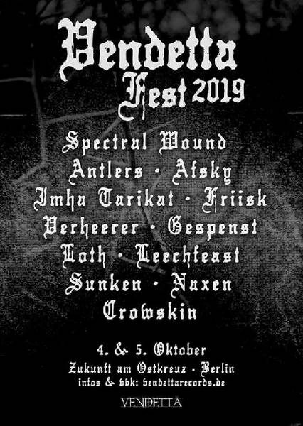 Obwohl an diesem ersten Oktober-Wochenende in Berlin so einiges an Konzerten geboten wurde, gab es für mich und viele andere Freunde des schwarzen Undergrounds ganz klar nur ein Ziel: Das vom Plattenlabel um Chef STEFAN KLOSE jährlich veranstaltete VENDETTA-FEST in der Edition 2019. Die Bandauswahl verhieß wieder Großartiges und die bewährte Location am Ostkreuz passt mit ihrem Underground-Charme, den äußerst moderaten Essens-/Getränkepreisen und einer völligen Entspanntheit der Leute wie das Bulls-Eye auf’s Dartbrett. Los geht’s