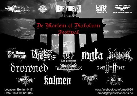 Am 18. und 19.12.15 steht im K17 in der Pettenkoferstraße ein Event an, bei dem jedem Metal Underground Liebhaber jetzt ziemlich die Ohren bimmeln müssten. Das De Mortem et DiabolumFestival! Es handelt sich hierbei um die Premiere eines Black/Death Metal und Doom Festivals, welches zwei Tage lang den Ground des Friedrichshainer Nachtclubs zum zerbersten bringen wird. Im Gegensatz zu bislang gewesenen Festivals in Berlin, beinhaltet das De Mortem et Diabolum Festival überwiegend Bands der düsteren, aber vor allen Dingen anspruchsvolleren Sorte. So darf man sich auf Black/Doom Bands wie The Ruins of Beverast oder Black/Death Bands wie Necros Christos, aber auch auf Bands wie Essenz, die mit ihrer selbsternannten Spectral Darkness das K17 vernebeln werden, oder auch die polnischen Black Metal-Kapuzen von MG?A freuen, die die Nackenmuskulatur mehr als beanspruchen werden. Die bislang bestätigte Bands in alphabetischer Reihenfolge: