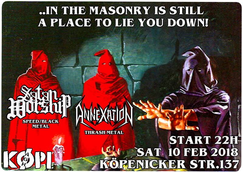 Einen feinen Geheimtipp haben wir für die Berliner Maniacs noch auf der Palette, welchen wir Euch natürlich nicht vorenthalten wollen. In diesem Fall handelt es sich um den Gig von SATAN WORSHIP, einer deutsch/brasilianischen Speed/Black Metal Konstellation. Keine Unbekannten werkeln hier an ihrem teuflischen Rifforkan, mit Marc von MORGOTH und Max und Fabiano von SODOMIZER werden sie sicherlich ein lautstarkes Teufelswerk gegen den Altar schmettern. Unterstützt werden sie von zwei weiteren Berliner Kapellen, SHRIKE und ANNEXATION, letztere sind mir bis dato noch nicht unter die Lauschmuschel gerutscht, sägen aber ein ein angemessenes, raubeiniges Thrash Manifest! Beginn ist 22:00 im Köpi (Köpenicker Str.137), also genau das