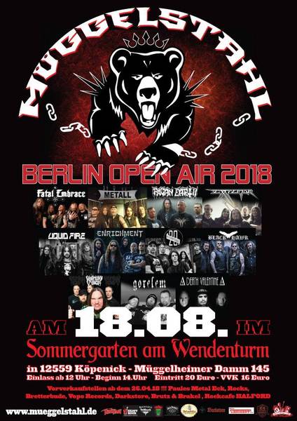 Unter der Federführung von Metall Chefdenker/–lenker und Halford Inhaber Sven Rappoldt wird nun die Idee eines metallischen Open Airs endlich in die Tat umgesetzt und unter dem Banner Müggelstahl am 18.August 2018 von der Kette gelassen. Bemerkenswert bei dieser Uraufführung ist der Umstand, dass von den 11 mittlerweile bestätigten Bands 9 aus Berlin stammen und somit von einem Event mit Lokalkolorit gesprochen werden darf. Find ick persönlich ausjesprochen jut…