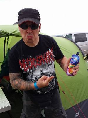 Dafür kam jetzt DAS Ereignis schlechthin an diesem Wochenende: Behemoth! Was Adam "Nergal" Darski und seine Mitstreiter hier veranstalteten, war in seiner Perfektion kaum noch zu überbieten! Alle Mitglieder stilsicher gekleidet, bösartige Bühnenaufbauten, brennende Kreuze und Flammensäulen, die bei geschätzten 40 Grad im Schatten zwar nicht hätten unbedingt sein müssen, dafür aber ihre optische Wirkung nicht verfehlten. Selbst Jette, die dieser Musik etwas kritisch gegenübersteht konnte nicht umhin zu erwähnen, dass dies recht beeindruckend gewesen sei. Pffft...die Untertreibung schlechthin, denn hier stimmte einfach alles! Egal ob neues oder altes Material, es war einfach nur zum niederknien und gleich als Opener "Blow your trumpets Gabriel". Es gab für mich kein Halten mehr und auch das angebotene Merch fand schnell den Weg in meine an diesem Wochenende etwas kleiner ausgefallene Einkaufstüte. Das war ganz großes Spargelstechen die Herren!