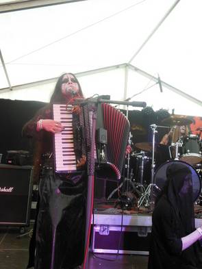 Uns zog es aber zur Zeltbühne, um Nashmeh zu erleben. Ich hatte schon im Vorfeld von einer sehr eigenwilligen Performance gehört, das versprach interessant zu werden. Ein zotteliger Derwisch an der Gitarre und eine Frau mit Akkordeon am Mirko, dazu noch ein Drummer und lebendige Deko in Form von zwei Mädels im Nonnenfummel, die die gesamte Show kniend verbrachten. Zuerst war das Gesicht verhüllt, dann sah man das Corpsepaint, während die eine ne Bibel und die andere den Koran hochhielt und schließlich begannen sie, langsam eine Seite nach der anderen herauszureißen, in den Mund zu stecken und dann angewidert auszuspucken. Am Ende stand man vor der Bühne zwischen güldenem Konfetti (noch von Insanity Alert) und zerkauten Bibelseiten. (Nebenbei, als am Sonntagmorgen ein Regenschauer niederging, sorgte ich mit meiner Bemerkung „hätte sie den Koran mal ganz aufgegessen“ für Fassungslosigkeit unter denen, die Nashmeh nicht gesehen hatten … ihr wisst doch, nur wenn der Teller leer ist, scheint die Sonne.) Abgesehen von der Optik war Nashmeh aber auch musikalisch ein Erlebnis. Das Akkordeon hatte mitnichten die Aufgabe, fröhliche Folk-Weisen zu intonieren, sondern war für finstere Black Metal-Atmosphäre zuständig, wo sonst der Bass, evtl. eine zweite Gitarre und/oder ein Keyboard spielen. Sehr schick und gern mal wieder.