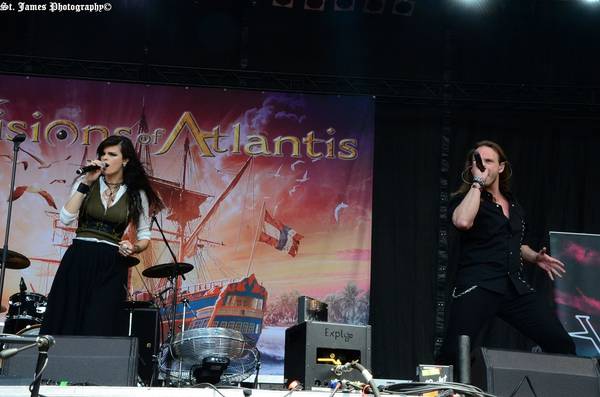 Die erste Band des Tages kommt für mich heute aus Österreich: Visions of Atlantis spielen zu früher Stunde auf. Da ich sowieso ein Fan des Symphonic Metal bin und außerdem auch mit dem Sänger-Duo Siegfried und Clementine das Frühstück verbracht hatte, war ein Besuch Ehrensache. Die Band beweist eine erquickende Spielfreude auf der Bühne und präsentiert den Fans sogar zwei komplett neue Songs vom kommenden Album, jedoch hätte der Sound ruhig etwas fetter sein können.