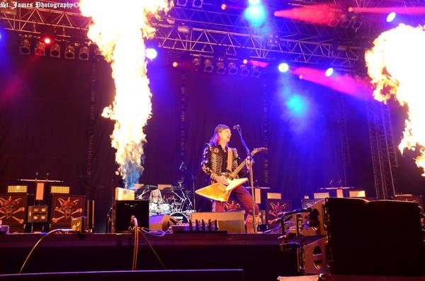 Ja, genau: Die Band um Rock’n’Rolf Kasparek, die 2009 bekanntgegeben hatte, dass sie aufhören und im selben Jahr beim Wacken Open Air einen ultra-schlechten Abschiedsgig gespielt hatten. Drei Jahre nach ihrem Abschied meldeten sich Running Wild mit dem Album »Shadowmaker« zurück. Inzwischen sind noch zwei weitere Alben erschienen und die Band kehrte 2015 sogar wieder livehaftig wieder auf die Bühne zurück – in Wacken. Dass Kasparek wohl wieder richtig Bock auf Rock’n’Roll hat merkt man vor allem in diesem Jahr, da Running Wild gleich mehrere Festival-Gigs spielten. Eines davon halt in Zlin. Da ich vorher mit dem Tour Management sprechen konnte, hatte ich sogar das Glück, als einziger Fotograf die restliche Show von der Bühne aus zu betrachten und zu knipsen. Kommen wir aber zur Show: