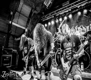 Cryptic Brood, ebenfalls in Niedersachsen beheimatet und schlanke 130 Kilometer von Nienburg entfernt aus Wolfsburg kommend, welches eigentlich nur durch den dort ansässigen VfL und den dort gegründeten Protector Bekanntheit erlangte…na gut…vielleicht auch ein bisschen VW…erklommen nun die Bühne und konnten mit ihrem doomig angehauchten Death Metal vollends überzeugen. Das Trio gab mächtig Gas und man hatte das Gefühl, die Jungens würden ihren Aufenthalt beim POA sichtlich genießen. Die Menge vor der Bühne jedenfalls war recht angetan und ließ sich gut unterhalten.