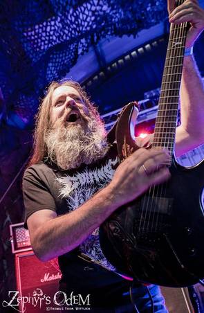 Nach dem Fußball Drama (wie dies für die Deutschen Balltreter ausging, wissen wir mittlerweile ja alle) stand nun die vorletzte Band auf der Bühne, die alles noch einmal in den Schatten stellen sollte, was sich vorher in Protzen zugetragen hatte: Just before dawn. Das schwedische Allstar Projekt mit Benediction Frontmann Dave Ingram, Anders Biazzi und Wombbath‘ Jonny Pettersson, der mit seinem monumentalen Bart alle anderen Fusselmatten Träger ins Abseits schubste, zog alle Register und streckte mit ihrem monumentalen Sound alle noch Wachgebliebenen gnadenlos zu Boden. Das Hauptaugenmerk lag natürlich auf dem aktuellen Meisterwerk „Tides of blood“, welches live um ein Vielfaches geiler klang, als auf der ohnehin schon exorbitant überragenden Platte. Hier wurde noch einmal aus allen Rohren gefeuert und man kann Mario und seiner Truppe wirklich nur dazu gratulieren, diese Megaband auf die Bühne gebracht zu haben. Dass das Publikum noch einmal vollends ausrastete, sollte schon fast keiner Erwähnung mehr wert sein.