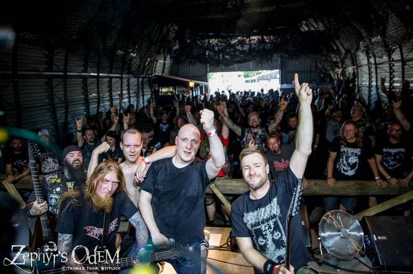Na, da lacht doch das Herz. DEATHRITE rotzen sich hier wieder einen Auftritt von der Bühne, dass einem das Bier im Munde tropft. Genau das richtige Tempo um die noch relative kühle Wetterlage wegzuheadbangen. Fette Riffs und noch dickere Grooves schaffen ordentlich dicke Luft im Hangar, der sich mehr und mehr füllt. Das schöne ist, man nimmt den Herren ihre devilish Rock´n´Roll Attitüde voll ab und das erzeugt mega gute Laune. Vom aktuellen Album wurden ordentlich viele Songs gespielt und hier wurde gewiss, der ein oder andere neue Fan gewonnen. [tom]