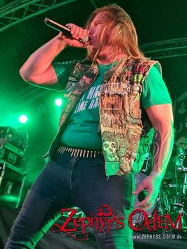 Die Setlist war ebenfalls gespickt mit vielen oldschooligen Granaten, wobei mir persönlich natürlich „Der Totmacher“ am meisten mundete, diesmal allerdings mehr musikalisch. Allerdings wünsche ich mir mal solche Granaten wie „Santa muerte“ oder „Under attack“ von der Bühne aus präsentiert zu bekommen, doch die Hoffnung stirbt ja zuletzt. Die Stimmung vor der Bühne war schon fast ausufernd und ich wunderte mich ein wenig, warum Postmortem nicht als Headliner spielten. Ok, kann natürlich daran liegen, dass man so im Anschluss mehr Zeit zum Vernichten gerstenhaltiger Erfrischungsgetränke hatte, was laut Augenzeugenberichten auch mehr als ausgiebig genutzt wurde. Ganz klar, die Postis haben abgeliefert, das Publikum ging steil und alle waren zufrieden. So und nicht anders muss das.