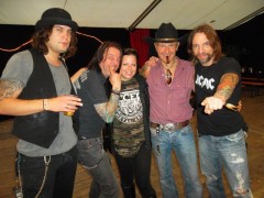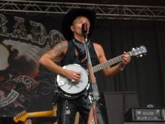 Nun aber zum ersten großen Highlight des Tages, denn Alex Kraft und seine Dezperadoz enterten die Bühne und bliesen zum großen Viehtrieb. Die Mikroständer stilecht mit Galgenstrick und Winchester ausgestattet, Alex beim Soundcheck und Flachmann in dem sich, wie er mir danach glaubhaft versicherte, kein Pfefferminztee sondern Bowmore befand, authentische Klamotten und mit „Under the gun“ einen mehr als fetten Opener. Großartig! Markus Kullmann verprügelte sein Kit, dass der gesamte Drumriser wackelte, Basser Alex Weigand und Gitarrist Nils Stuerzer waren permanent unterwegs, vor der Bühne war es voll…so muss das sein! Der Sargmacher nahm Maß, bei „Saloon No.10“ bekam Cowboy Kraft eine Flasche auf den Hinterkopf und Nils ballerte mit seinem Colt in der Gegend rum. Dazu noch Coverversionen von den Doors („Riders on the storm“), „Raw hide“ und natürlich zum Abschluss den Johnny Cash Klassiker „Ghostriders in the sky“, bei dem sogar 10 Minuten nach Ende des Gigs die Leute noch mitsangen. Freunde, das war gaaaanz großer Fußball und ein Sieg auf der ganzen Linie. Die Dezperadoz sind einzig, aber nicht artig!