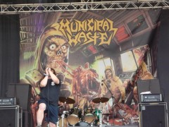 Nun aber die grobe Thrash Keule, denn Municipal waste aus Richmond sollten das Gelände verwüsten, was ihnen aufs vortrefflichste gelang. Kein Wunder, hat der Vierer ja auch grade mit „The fatal feast“ einen extrem fetten Thrash Brocken veröffentlicht, der zum totalen Moshen mehr als animiert. Der Kollege neben mir konnte sogar fast alle Texte mitbrüllen und der Circle Pit rotierte heftigst. Selbst ich drehte zu Krachern wie „Repossession“ oder „The art of partying“ zwei Runden und erfreute mich danach in aller Ruhe an der fetten Performance der Amis, bei dem vor allem die Klampfe von Ryan Waste hervorstach. Neon Gelb, unten M, oben W. Was für ein Costum Geschoss…hervorragend! Nach einer viel zu kurzen Dreiviertel Stunde war dann Schluss und MW hinterließen eine riesige, kreisrunde Mulde vor der Bühne. Klasse!