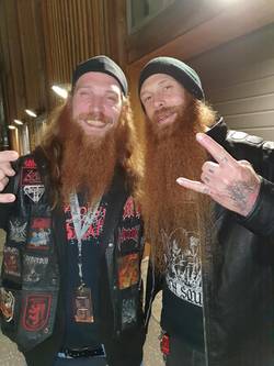 Aufgrund der frappierenden Ähnlichkeit zwischen unserem allseits beliebten und berüchtigten Sven und Darkness Basser Ben musste natürlich unbedingt ein Beweisfoto gemacht werden. Um dieses Vorhaben in die Tat umzusetzen, preschte mein Frauchen hinter dem Viersaiter hinterher und fing an, ihn auf Englisch um exakt dieses Foto zu bitten. Der Basser guckte zwar etwas irritiert, kam aber dem Wunsch nach. Allerdings guckte meine Herzdame dann doch etwas verdutzt, als wir dann plötzlich mit dem sympathischen Rotschopf anfingen, auf Deutsch fachzusimpeln. Guter Lacher! Dazu musste ich Exhorder Gitarrist Vinni La Belle davon überzeugen, dass meine Freundin und Sven nicht miteinander liiert sind, sondern ich der Mann ihrer schlaflosen…aber lassen wir das.