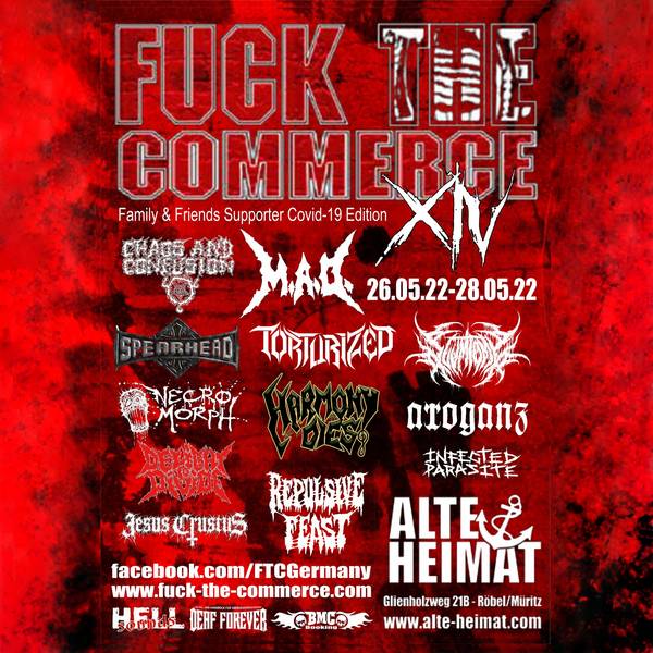 Das Fuck-The-Commerce XIV findet in diesem Jahr als "Family & Friends Supporter Covid-19 Edition" im kleineren Rahmen vom 26. bis 28. Mai in der ALTE HEIMAT in Röbel/Müritz statt. Gute 2 Jahre Pandemie haben auch uns alle stark gebeutelt und das bisherige Programm lässt sich so nicht halten. Es wird ein wenig familiärer, kleiner und Open Air. Das FTC-Team hofft, ihr habt Verständnis und unterstützt das FTC in alter Stärke. Darauf sind sie angewiesen.
