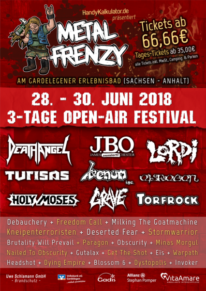 Der erste Vorbericht heute kommt zum Metal Frenzy, welches in diesem Jahr zum 5.Mal die Pforten zur Hölle öffnet und erneut mit einem, für diese Größenverhältnisse, exorbitant geilen Billing aufwarten kann. In der Mitte Deutschlands geht es also ab dem 28.06.2018 richtig rund und wir werden natürlich ausführlich berichten.