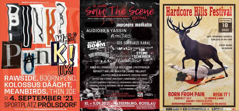Gleich vier Festivals beglücken uns im September. Nämlich das KRACHFEST, das HARDCORE HILLS FESTIVAL, das abgespeckte KRACH AM BACH sowie das SAVE THE SCENE. Wenigstens etwas. Das BACK TO FUTURE wurde ja leider kurzfristig wieder auf 2022 verschoben. heul, schluchs.