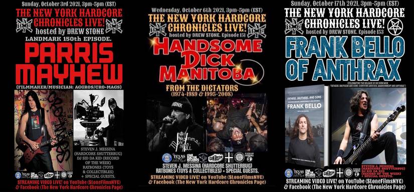 Diesmal plaudern am 03.10 PARRIS MAYHEW von den CRO MAGS, am 06.10 HANDSOM DICK von den DICTATORS und am 17.10 FRANK BELLO von ANTHRAX aus dem Nähkästchen.