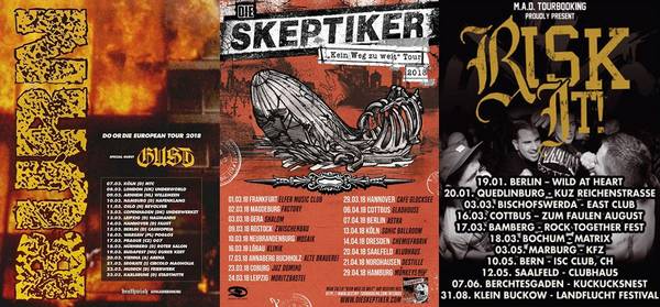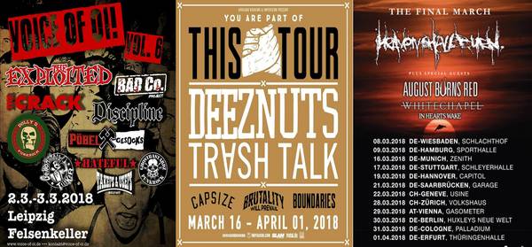 Dicke Festivals oder übermächtige Tourneen gibt es 03/2018 nicht wirklich zu verbuchen, außer das punkige VOICES OF OI – FESTIVAL und die bunte YOU ARE PART OF THIS TOUR mit DEEZ NUTS, TRASH TALK u.a. Das ist aber nur die Ruhe vor dem Sturm, lauern ja schon die großen Sommer Open Airs und ausgiebige Touren. Ein paar interessante Konzerte sind aber trotzdem am Start. Zum Beispiel die ruppigen HEAVEN SHELL BURN sind unterwegs, BURN kommen mit GUST, die legendären SKEPTIKER machen das Land unsicher, RISK IT reisen auch die Republik, JUDICIARY kommen auch für ein paar Shows, PUNISHABLE ACT geben sich die Ehre und NEGATIVE APPROACH quetschen sich ebenfalls in einen Nightliner. Leider wurde die langerwartete ALL OUT WAR – Tour abgesagt. Termine werden aber so bald als möglich nachgeholt.