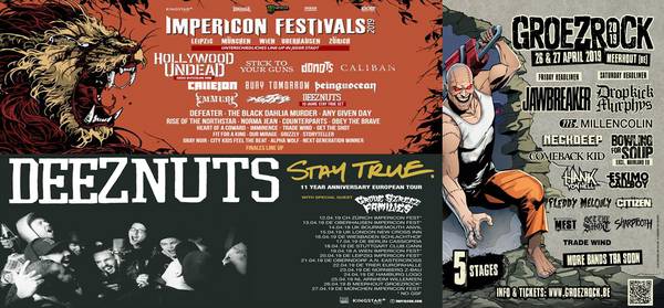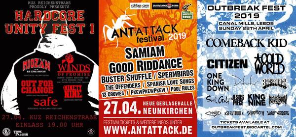 Die Bands scheinen wieder flügge zu werden und packen die Koffer für diverse Rundreisen. Es stehen diverse Leckerlis auf dem Speiseplan. Hier die Highlights für April: die IMPERICON FESTIVALS, das ANT ATTACK FESTIVAL, das HARDCORE UNITY FEST I, in England das OUTBREAK FEST und bei unseren belgischen Nachbarn gibt es wieder das GROEZROCK FESTIVAL.