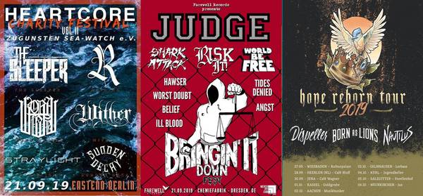 Dafür schwirren aber wieder reichlich Bands durch die Klubs. Viel Neues, aber auch diverse Oldschool – Veteranen geben sich die Ehre. Als da wären : HELMET sind auf 30th Anniversary - Tour, JUDGE gurken ebenfalls ausführlich durchs Land. Vereinzelte Shows könnt ihr aber noch von PROTECTION OF HATE, BORN FROM PAIN, THIS MEANS WAR, MORTALITY RATE, TRASH BOAT, SHARK ATTACK, OFFSIDE, SLY OLD DOG, VLADA INA, LOCK & KEY und OFF WITH THEIR HEADS in diversen Klubs besuchen. Hier nicht veröffentlichte Tourdaten : wie immer zu finden irgendwo im WWW.