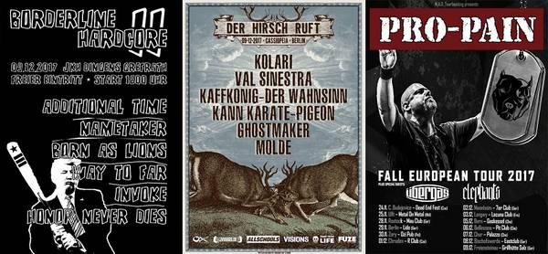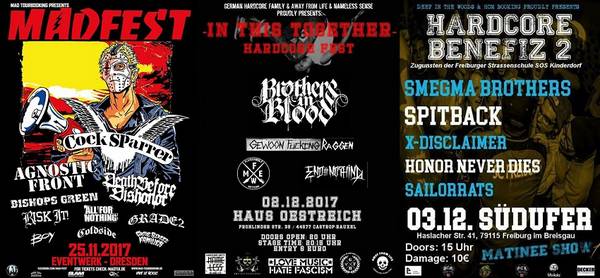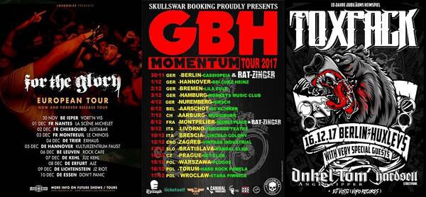 In den Klubs geht es momentan auch noch relativ heiß her. PRO PAIN, STICK TO YOUR GUNS und Großkotz HARLEY FLANAGAN sind noch hier und da zu bewundern, FOR THE GLORY schleichen noch rum, BOOZE & GLORY zocken auch noch gelegentlich und die alten Punx von GBH wollen es ebenfalls nochmal wissen. Besonderes Augenmerk sei auf das zehnjährige Heimspiel – Jubiläum von TOXPACK gerichtet. Leider auch bittere News. Die eigentlich unkapputbaren TROOPERS mussten ihr Heimspiel am 02.12.17 in Berlin absagen, da Frontrüpel Atze zurzeit etwas lädiert ist. Das Konzert wird aber nachgeholt.