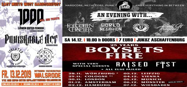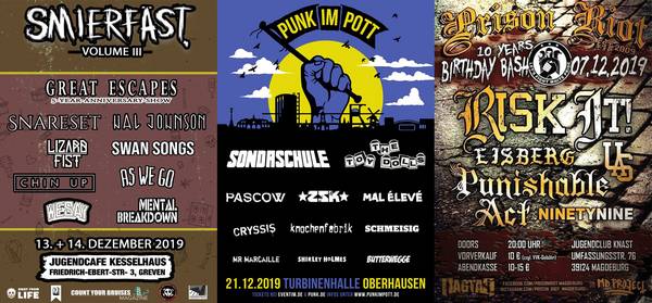 Der 12. Monat im Jahr bietet auch wieder diverse Indoor – Festivals. Leider nicht mehr all zu große, dafür aber ein paar gemütliche kleine, die es lohnt zu besuchen. Das 3. SMIERFÄST gibt sich nochmal die Ehre und PUNK IM POTT bittet zum Pogo. Ansonsten wären noch das AN EVENING WITH... FEST, die 10. Geburtstagssause vom PRISON RIOT, das EAST MEETS WEST HARDCORE FEST und das 16. HARDCORE WINTERFEST als Ausgehtipp zu erwähnen. Leider gibt es auch ne schlechte Mitteilung, das KRAMPUSFEST musste leider abgesagt werden. Traurigguck !!!