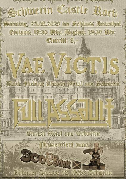 Für 8 Taler werden Full Assault und Vae Victis als Lokalmatadore dieses Fest erstmalig gestalten und bespielen. Das klingt nach Balsam für die maßlos unterfütterte Konzertseele in uns allen hier in und um Schwerin.