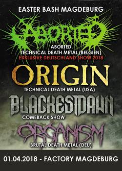 Die Magdeburger Blackest Dawn sind zurück. Nach zweieinhalbjähriger Bühnenabstinenz kehrte das Sextett aus der Magdeburger Börde nun am 01.04.2018 auf die „Bretter die die Welt bedeuten“ zurück. So weit, so gut – als dann das komplette Paket bekannt wurde, glaubten dann doch einige Fans (berechtigt (?!?)) an einen Aprilscherz, denn für das Comeback hatten die Jungs in die Magdeburger Factory eingeladen und sich für den Abend mit keinen geringeren als den Extreme Metal – Größen mit Aborted und Origin verstärkt. Als weiterer Support wurden die Köthener Organism dazugeholt, um den Undergroundgedanken hochzuhalten und noch eine weitere regionale Band hinzuzuholen.