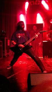 Nun aber der Hauptact…und es war voll im H.O.F. Ein riesiger Drumriser, schöne Bühnendeko, ein unheilvolles Intro vom Band und Feuer frei für Postmorten, die gleich mit „Under attack“ vom neuen Album einen formidablen Start hinlegten, obwohl der Sound anfänglich ziemlich undifferenziert aus den Boxen kam, was Tonmeister Jacky aber schnell einfing und somit der weiteren todesbleiernden Beschallung seinen Lauf ließ. Putz war gut bei Stimme, Max trommelte wie ein Uhrwerk, Tilo stapfte über die Bühne und machte viele Positionstäusche mit Marcus, der seine Riffs ohne Erbarmen in die Menge schoss. Das macht Spaß, das macht Laune. Eine großartige und ausgiebige Setlist und ein feiner Pit vor der Bühne machten diesen Auftritt so richtig erinnernswert und entließ mich in die eiskalte Nacht in der Erkenntnis, dass Postmortem einfach zur Speerspitze des deutschen Todesbleis gehören und dort auch nicht so schnell verdrängt werden können.
