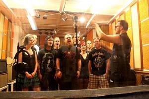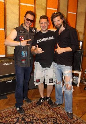 Was so eine Schar an Gast-background Sängern/innen so alles anrichten können, belegte eindrucksvoll der Tisch im Vorraum des Tricone Studios, denn die gegen 14 Uhr eingefallene Horde verzehrte so ziemlich alles, was nicht auf drei auf den Bäumen war. Pech für Jette und mich, da wir erst gegen 16 Uhr einrücken konnten um a) ebenfalls die neuen Songs der Kamikaze Kings mit einem gutturalem Gekrächz zu veredeln, b) ein klein wenig in das bereits Geleistete reinzuhorchen und c) einfach nur eine schöne Zeit mit den zu echten Freunden gewordenen Musikern zu verbringen. Zwei Becher koffeinhaltige Brause und ein paar Gummibärchen später stand ich dann im Aufnahmeraum, um zusammen mit Frontsau Elmo, der reichlich abgespeckt fit wie nie ausschaute, mehrmals „KING!!!“ und „BACKDOOR!!!“ ins Mikro zu grunzen…ja liebe Freunde, zu grunzen!!! Nichts mit Zurückhaltung oder filigranem Tralala... HIER WURDE DERBST GEROCKT!!!
