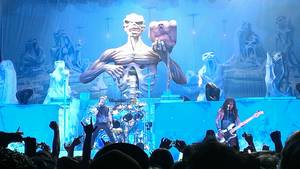 Klar, was den Worten von Horror-Legende Vincent Price nun folgte und erneut ging die Halle steil. Selbst die Sitzplätze hielt es nicht mehr auf Selbigen und alles stand und feierte, auch die Monsterklassiker „Phantom of the opera“, „Run to the hills“ oder „Wasted years“. Mein persönliches Highlight war dann allerdings der Titeltrack des 88er Albums, den ich, so wie viele Andere auch, aus voller Kehle mitsang. „Seventh son…“, wie geil war das denn? Ok, einen recht neuen Song gab es mit „Fear of the dark“ dann doch noch, denn mit gerade mal 23 Jahren war dies wahrhaftig der aktuellste Song in der Setlist der Legenden.