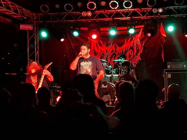 Denn auf dem Flyer steht zwar To Violently Vomit, ein Blick in die Metal Archives enthüllt aber schnell, dass das zwei Drittel der Brutal Death-Legende Disgorge sind die ergänzt durch einen Schlagzeuger, Überraschung, auch Disgorge spielen. Und zwar nur mit Gitarre, Schlagzeug und Micro. Das reicht dem Publikum völlig aus, um amtlich den inneren Primaten die Kontrolle übernehmen zu lassen. Sänger Angel Ochoa und Saitenmagico Diego Sanchez wurden nicht müde allen Anwesenden, Bands als auch Primaten, ihre Dankbarkeit auszusprechen und hatten vor diesen letzten Tag der Tour zu nutzen, um nochmal alle Regler auf komplette Vernichtung zu stellen. Die abschließende Zugabe „Womb Full Of Scabs“, unterstützt von 50% Defeated Sanity, unterstrich das nachdrücklich.