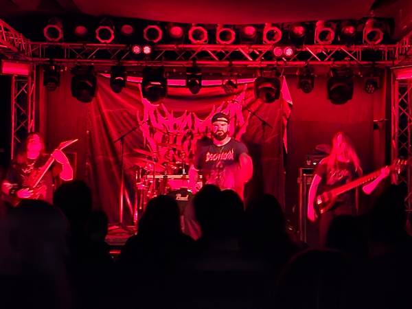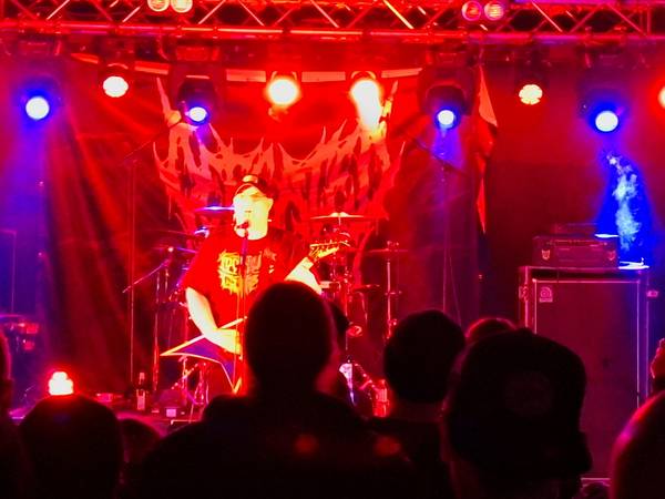 Bereits 18:30 Uhr, eine Stunde nach Einlass sollten Embryonic Devourment den Rummel eröffnen und mit minimalem Verzug legten die drei Reptiloidenfreunde aus California los. Nach den erwartbaren Soundfeinjustierungen im Opener krachte auch sofort mein Favorit „Cathy O'Brien Experience“ rein. Insgesamt ein netter erster Act dem auch verziehen sei, dass die erste Ansage „What’s up Berlin!!“ nicht ganz so gut ankam, was sie selbst bemerkt haben um sich folgend ein paarmal zu berichtigen. Bassist und Sänger Austin Spence war kurz vorm Ende des Abends freundlicherweise dabei gratis Tour-Shirts zu verteilen, das sollte nicht unerwähnt bleiben.