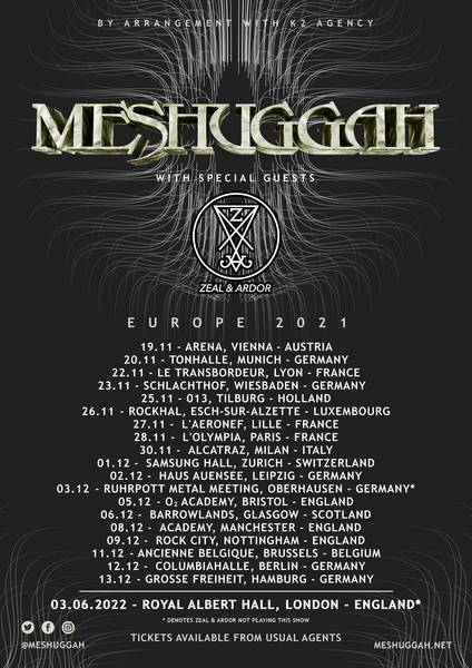 Die schwedischen Extrem-Tech-Metal-Pioniere MESHUGGAH kündigen ihre Europa Tourneedaten für den November und Dezember 2021 an. Die Band arbeitet derzeit mit Hochdruck an dem Nachfolger zu "The Violent Sleep Of Reason", das vor vier Jahren erschienen ist. Den Startschuss der Tournee geben MESHUGGAH am 19. November in Wien. Special Guest (außer in Oberhausen) ist der Schweiz/Amerikanische Post Black Metal Act ZEAL & ARDOR. Außerdem geben MESHUGGAH bekannt, dass sie am 3. Juni 2022 in der legendären "Royal Albert Hall" in London spielen werden!