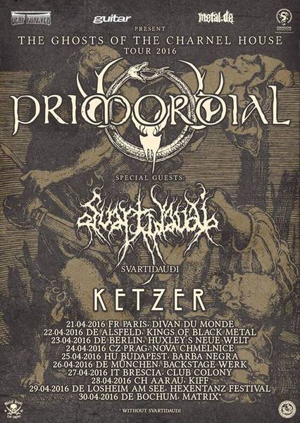 Primordials O-Ton dazu: "Na, ist es nicht wieder an der Zeit, Europa heimzusuchen? Die Tour ist längst überfällig, aber bei uns ziehen die Jahre wie im Flug ins Land. Jedenfalls sind wir jetzt 2016 bereit, anderthalb Wochen mit Ketzer und Svartidaudi auf Reisen zu gehen. Da man erntet, was man sät, haben wir ein interessantes Programm zusammengestellt und werden unsere Diskografie mit einer langen Spielzeit würdigen - denkwürdig ganz im Sinne der Konzerte in den 1970ern…Keine Festivalsets diesmal, also macht euch darauf gefasst, dass Europa brennen wird. Wir sehen uns zum Feiern der GHOSTS OF THE CHARNEL HOUSE!"