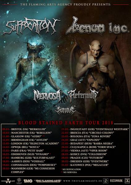 Obwohl die Tourdatenbank in diesem Frühjahr bereits gut gefüllt ist, möchten wir euch noch folgendes Package ans Herz legen: SUFFOCATION zusammen mit VENOM INC. als Co-Headlinertour, dazu noch NERVOSA (Female Fronted Thrash aus Brasilien), AETERNAM (Ethnic Symphonic Metal aus Kanada) und SURVIVE (Thrash aus Japan). Diesen sehr bunten Strauß harter Klänge könnt ihr zu folgenden Gelegenheiten genießen: