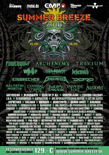 Der versierte Metal-Nerd, sowie der klassische Metal-Open Air-Fan, kann sich wiederum auf ein erneut erlesenes Bühneprogramm freuen. Die Zugpferde in diesem Jahr sind: Powerwolf, Arch Enemy, Trivium, W.A.S.P., Papa Roach, Behemoth, Eisbrecher, Doro und Dirkschneider. Gerade Herrn Dirksscheider´s Kombo dürfte ein Happening der Sonderklasse werden, weil es die letzte Show mit erlesenen Accept-Klassikern sein dürfte. Mittwochs kann man, zum Auftakt des Festivals, wieder die Nuclear Blast Label Nacht auf der T-Stage bestaunen. Dieses Jahr dabei sind u. a.: Paradise Lost, Sepultura, Kataklysm, Farmer Boys, Ross The Boss, RAM, Any Given Day, Warbringer und The Night Flight Orchestra.