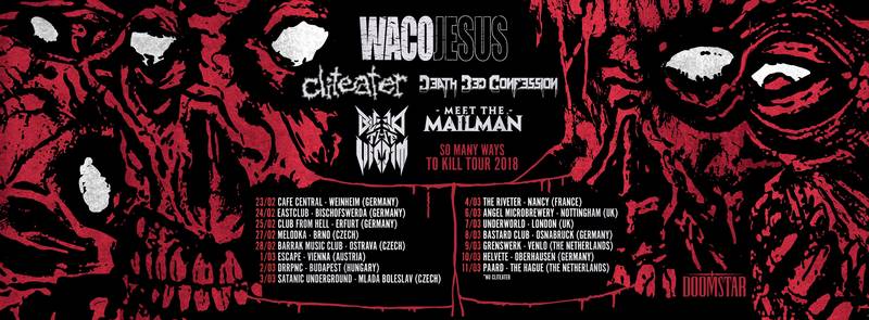 Bereits Mitte Februar beginnt die SO MANY WAYS TO KILL Tour mit den schlüpfrigen und frivolen Death Grindern von WACO JESUS. Da wird sicher wieder eifrig an den Genitalien gespielt und mit CLITEATER gibt’s auch einen mehr als ordentlichen Co-Headliner für die Gangbang-Party. Die von Doomstar Bookings vorangetriebene Tour hat mit den folgenden Support-Bands ein amtliches und ja auch abwechslungsreiches Undergroundpaket geschnürt: DEATH BED CONFESSION, BLEED THE VICTIM und MEET THE MAILMAN!