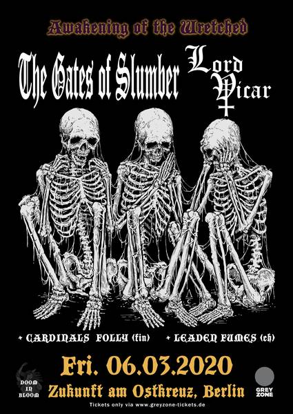 Die Dudes von Greyzone und Doom in Bloom veranstalten somit am 6.März im Berliner Zukunft am Ostkreuz im Rahmen dieser Tour einen ansprechenden Doom Abend, mit dem Support von Cardinals Folly aus Finnland und den Schweizern Leaden Fumes, die erstmalig in Berlin auf den Brettern stehen. Es ist also angerichtet, für Freunde der pechschwarzen Untergangszeremonie, haha! Also sichert Euch dieTickets für die „Awakening Of The Wretched“ Doom Metal Lobpreisung! Diese könnt ihr direkt bei Greyzone oder bei Koka abgreifen, falls es mit den Freikarten nicht geklappt hat. Doom Or Be Doomed!